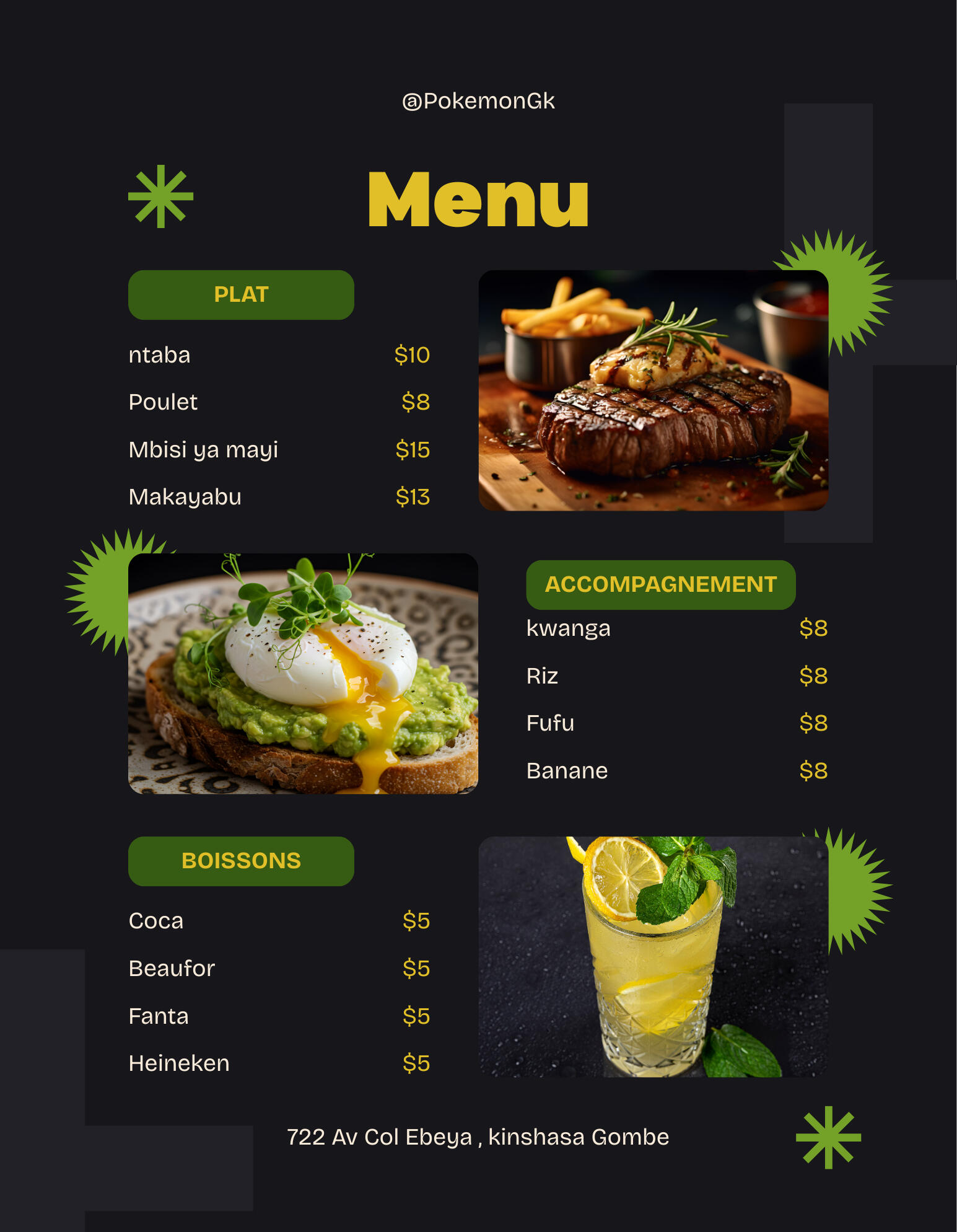 Né de la passion pour la bonne cuisine, la musique et l’art de recevoir, notre établissement a été pensé comme un lieu de rencontre et de partage. Ici, chaque détail compte des saveurs soigneusement préparées à l’ambiance qui fait vibrer les soirées kinoises.Notre mission est simple : offrir une expérience authentique où la gastronomie, la convivialité et l’énergie de Kinshasa se rejoignent. Que ce soit pour un repas entre amis, un moment de détente après le travail ou une soirée spéciale, nous vous accueillons dans un cadre élégant et chaleureux.Plus qu’un bar ou un restaurant, nous sommes un espace de vie, un lieu où les souvenirs se créent, où les conversations durent, et où chaque visite devient une expérience à part entière.